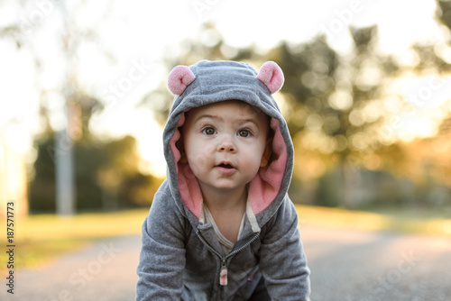 Baby in a super cute mouse, animal costume, happy one year old girl. Baby loves outdoors and parks