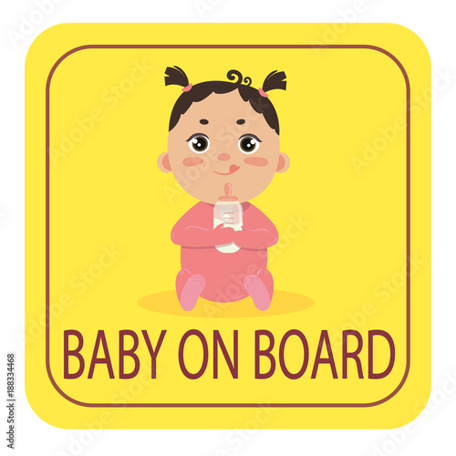 Baby in car sign. Babygirl with milk bottle in footie cloth sitting on yellow background. Safety sticker. Warning sign for vehicle. Boy on board cion for drivers with kids.