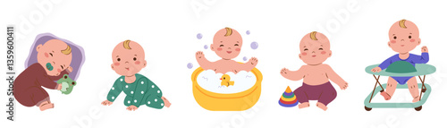 Baby life set. Cute infant activities. Little child bathing, crawling, playing, sleeping. Happy toddlers, small kids