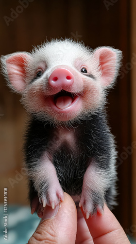Baby pig is smiling and looking at the camera. Concept of warmth and happiness, as the pig appears to be enjoying the attention and interaction with the person holding it