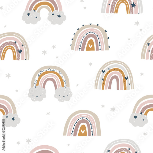 Baby rainbow kids seamless pattern design, pastel colors. Nursery background with cute rainbows and clouds on white background