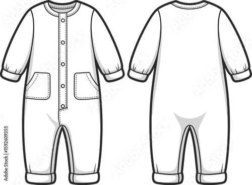 Baby romper sketch front and back view, button detail, collar, pockets, cad drawing flat vector illustration, children’s apparel template
