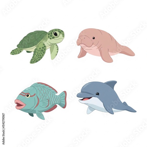 Baby Sea Animals of Indonesia Vector Set – Turtle, Dugong, Napoleon Fish, Dolphin