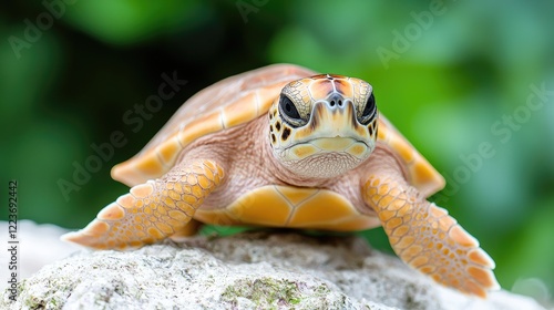 Baby sea turtle on rock, tropical beach background, wildlife conservation