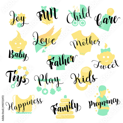 Baby Shop Hand Drawn Logo Set. Childhood Accessories. Retro vector illustration
