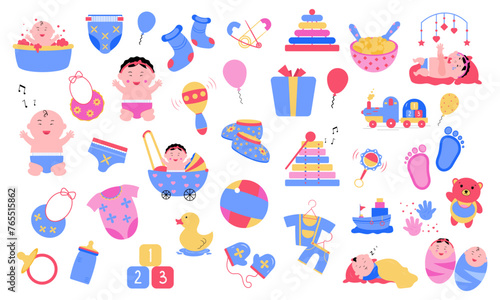 Baby shower flat minimalistic cute colorful set of icons and symbol. Vector illustration.