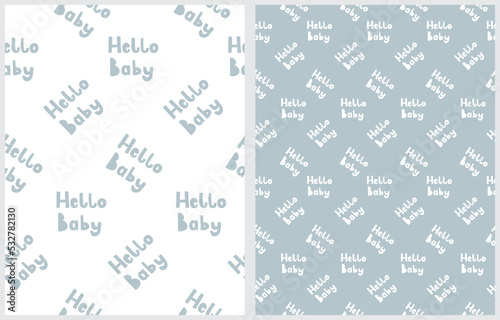 Baby Shower Seamless Vector Patterns with Handwritten Hello Baby Isolated on a White and Pastel Blue Background. Boy's Welcome Party Print ideal for Fabric, Textile, Wrapping Paper.
