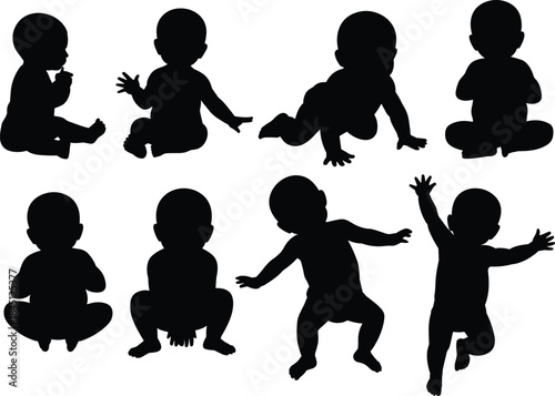 Baby, silhouette, set, infant, sitting, crawling, standing, walking, development, stages, childhood, growth, milestone, human, black, isolated, white, background, vector, illustration