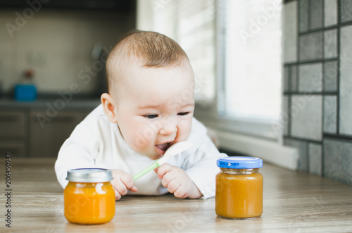 baby with blue eyes wants to eat mashed potatoes in a jar with a spoon in his hands