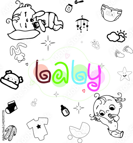 Baby's world. The child plays, sleeps around his toys, baby food, diaper, pacifier, stroller. Vector illustration suitable for a logo of a children's store, printing on fabric