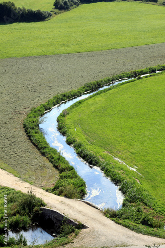 Bachlauf inmitten von grünen Wiesen und Feldern