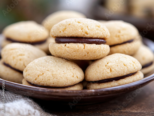 Baci di Dama cookies. Italian Piedmont sandwich biscuit consisting of two hazelnut biscuits joined together by a chocolate filling.