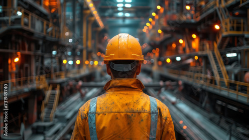 back of the head mid shot of male steel working wearing orange hat standing in the middle of a modern and clean steel plant,generative ai