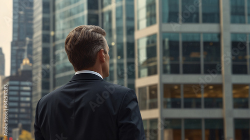 Back of young businessman in suit standing in front of modern office, business growth concept.