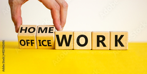 Back to normal. Hand turns cubes and changes words 'home work' to 'office work'. Beautiful yellow table, white background. Copy space, Business and home or office work concept.