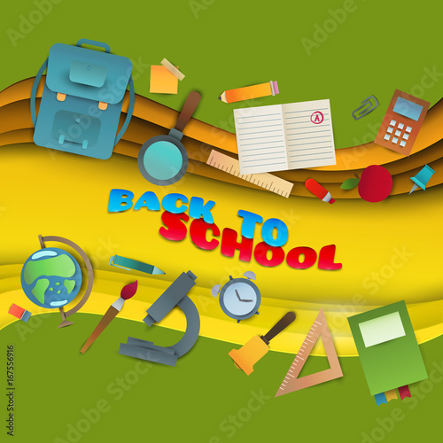 Back to school background. Paper cut cartoon polygonal trendy craft style. Modern origami teaching, education and learning symbol design. Concept for poster, banner. Vector illustration.