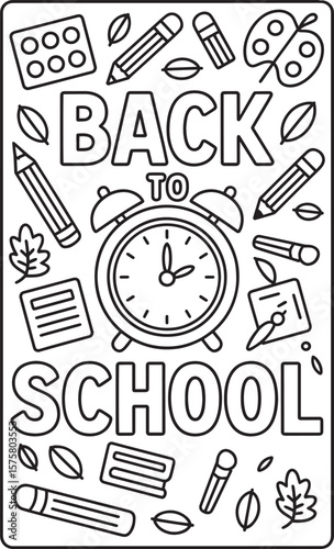 Back to School Coloring Page with Alarm Clock and School Supplies Vector Illustration, Back to School Coloring, School Supplies Coloring, Alarm Clock Coloring Page, School Doodle Vector