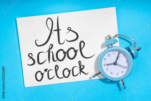 Back to school concept, simple minimal back to education background with small alarm clock with text Its school o'clock, on light blue background top view copy space