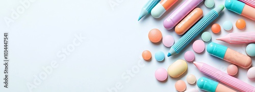 Back to school concept with a double border school supplies banner. Top view on a white background.