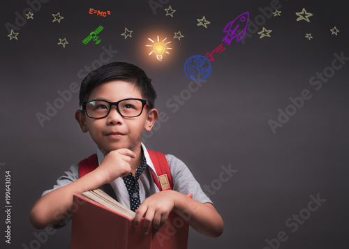 Back to school, Happy child little boy with glasses reading a books, Concept of education and reading. The development of the imagination, Image dark tone