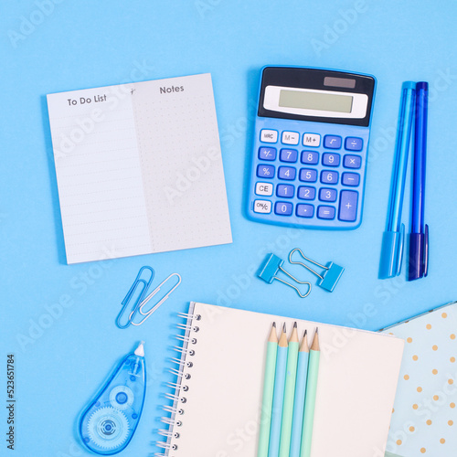 Back to school layout with school stationery in blue color on pastel blue background. Flat lay