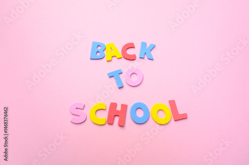 "Back to School" lettering made from colorful foam letters (blue, red, yellow, pink) on pink background. Perfect for classroom visuals, marketing, social media content, and preschool design.