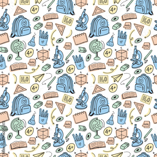 Back to school seamless vector pattern. Pattern school supplies. Vector illustration. Hand-Drawn doodle sketch, Flat design. Multicolored elements