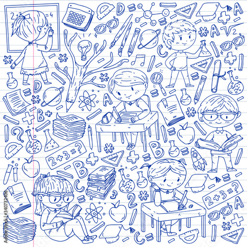 Back to school. Vector icons and elements for little children, college. Doodle style, kids drawing