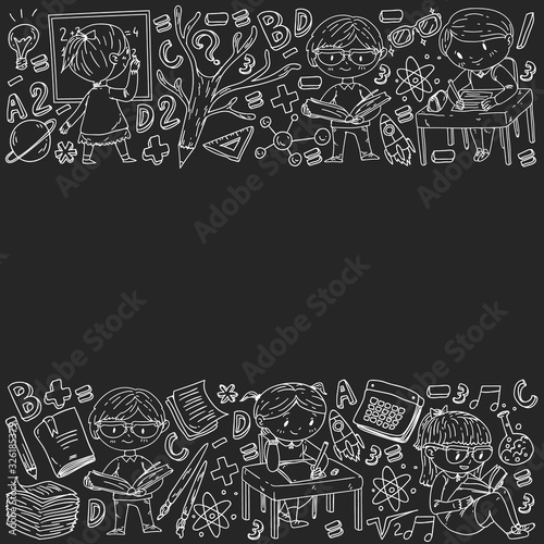 Back to school. Vector icons and elements for little children, college, online courses. Doodle style, kids drawing