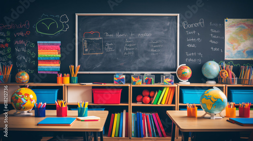 Back to school: Vibrant classroom scene filled with colorful chairs and desks, colorful stationery, and a chalkboard displaying inspiring quotes