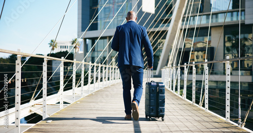 Back view, businessman and travel with suitcase in city for corporate trip or journey on bridge. Man, traveler or walking with luggage for urban business, new career or job opportunity downtown