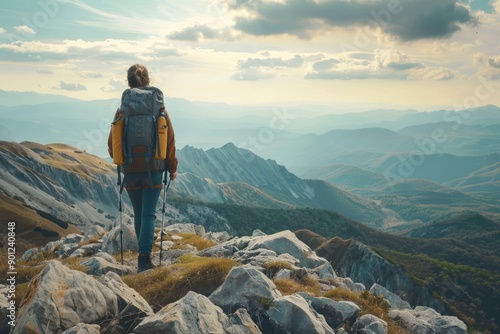 back view hiker fully equiped standing on the mountain top and enjoys the panoramic landscape
