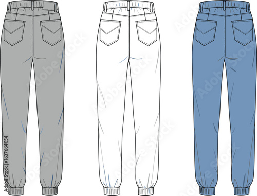 Back view jogger pants in grey, white, and blue, fashion flat sketch, casual sportswear design, unisex apparel template, vector clothing illustration