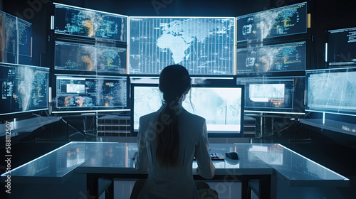 Back view of a businesswoman in a control room of a financial office. Generative AI
