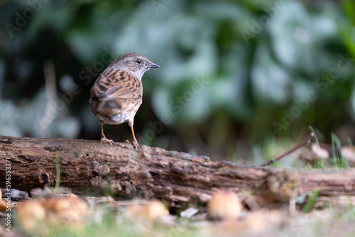 Back view of a Dunnock (Prunella modularis) that is perched on top of a piece of wood in a hedge - Yorkshire, UK in March