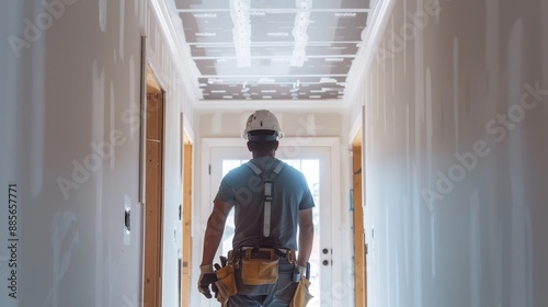 Back view of a man contractor at work inside a home for renovation and refurbishment project , complete energy efficiency renovation concept image