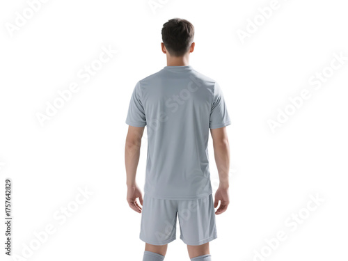 Back view of a man in light gray sports shirt and shorts, suitable for sports and physical exercise.