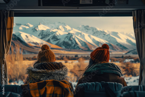 Back view of a senior couple sitting in a train, admiring the scenic mountain landscape