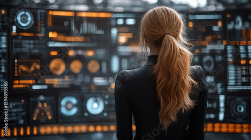 Back view of a woman immersed in a futuristic chaotic scene filled with glowing screens, digital icons, and data noise. Conceptual image illustrating information overload and technology overwhelm.