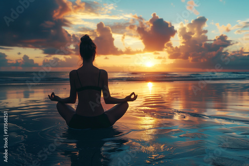 Back View of a Woman Practicing Yoga at Sunset on the Beach