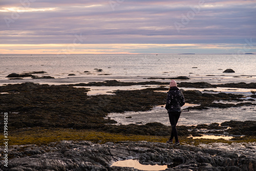 Back view of a woman walking on the shore in the Bic national park, at sunrise, Canada