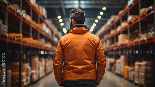 Back view of a worker male in modern warehouse.