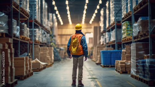 Back view of a worker wearing a yellow hat in a warehouse