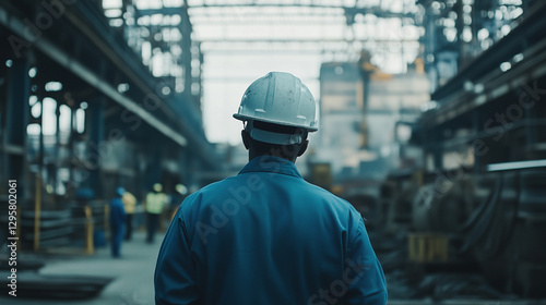 Back view of an industrial worker wearing a blue uniform and safety helmet in a steel factory, surrounded by heavy machinery, metal sparks, and industrial equipment, symbolizing labor and manufacturin