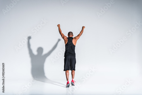 back view of athletic african american sportsman triumphing with raised hands on grey