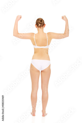 Back view of athletic woman show her muscles