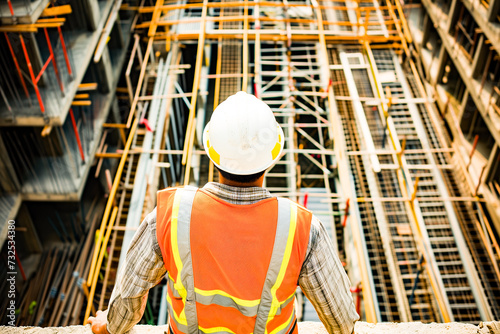 Back view of construction worker wearing safety uniform during working on roof structure of building on construction site.