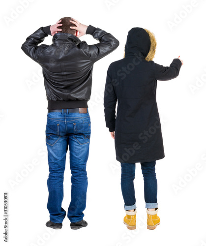 Back view of couple couple in winter jackets pointing.