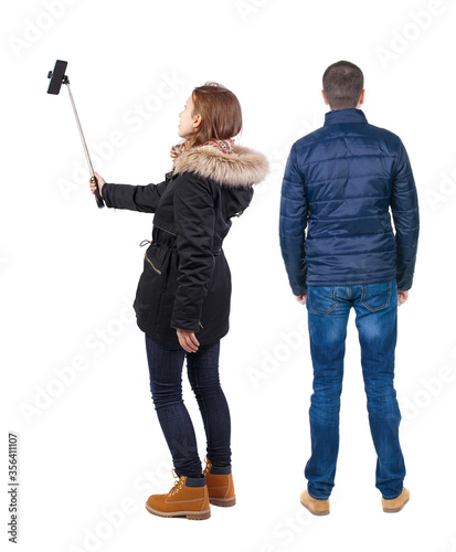 Back view of couple in winter jacket photographed on a mobile phone in winter jacket.