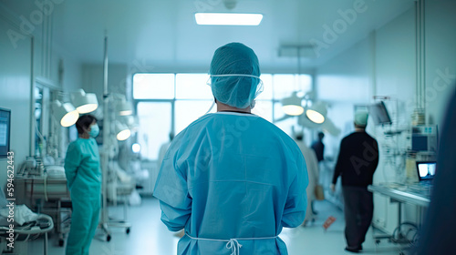 Back view of female surgeon in a hospital intensive care unit. Generative AI